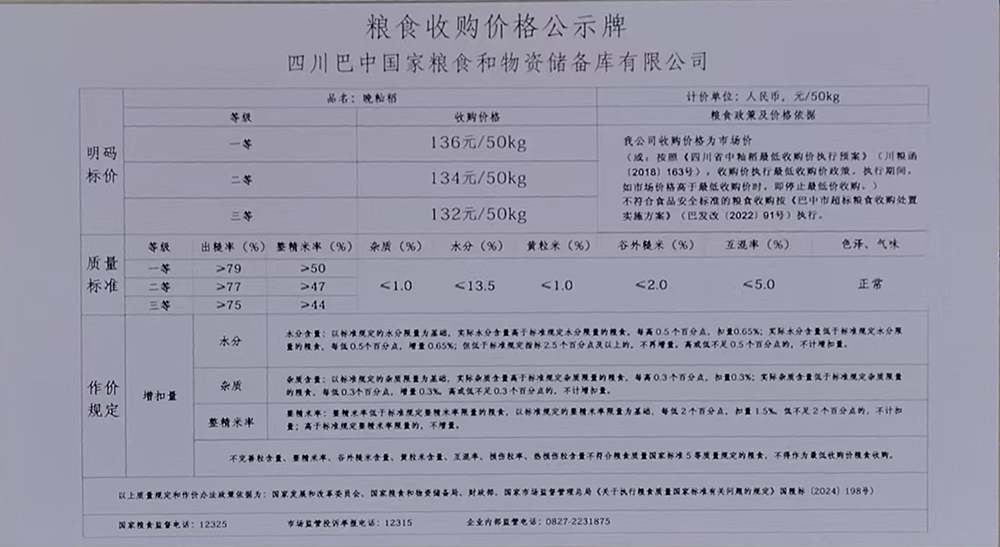 為認(rèn)真貫徹國(guó)家糧食收購(gòu)政策,全面落實(shí)省、市決策部署,踐行糧食安全黨政同責(zé)責(zé)任,充分發(fā)揮行業(yè)主體責(zé)任,做好秋糧收購(gòu)工作,切實(shí)保護(hù)種糧農(nóng)民利益?,F(xiàn)將四川巴中國(guó)家糧食和物資儲(chǔ)備庫(kù)有限公司2025年秋糧收購(gòu)相關(guān)信息公示如下: